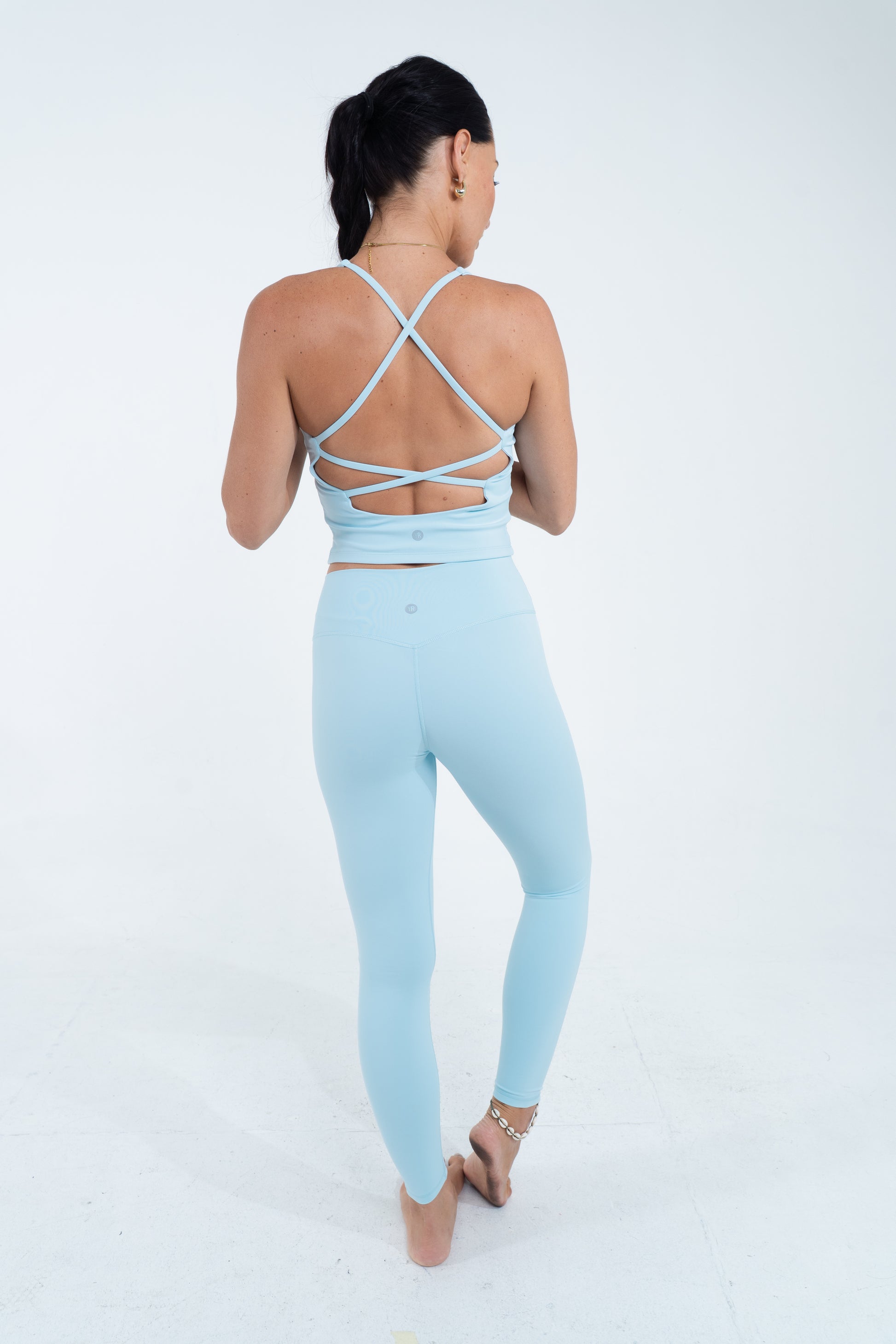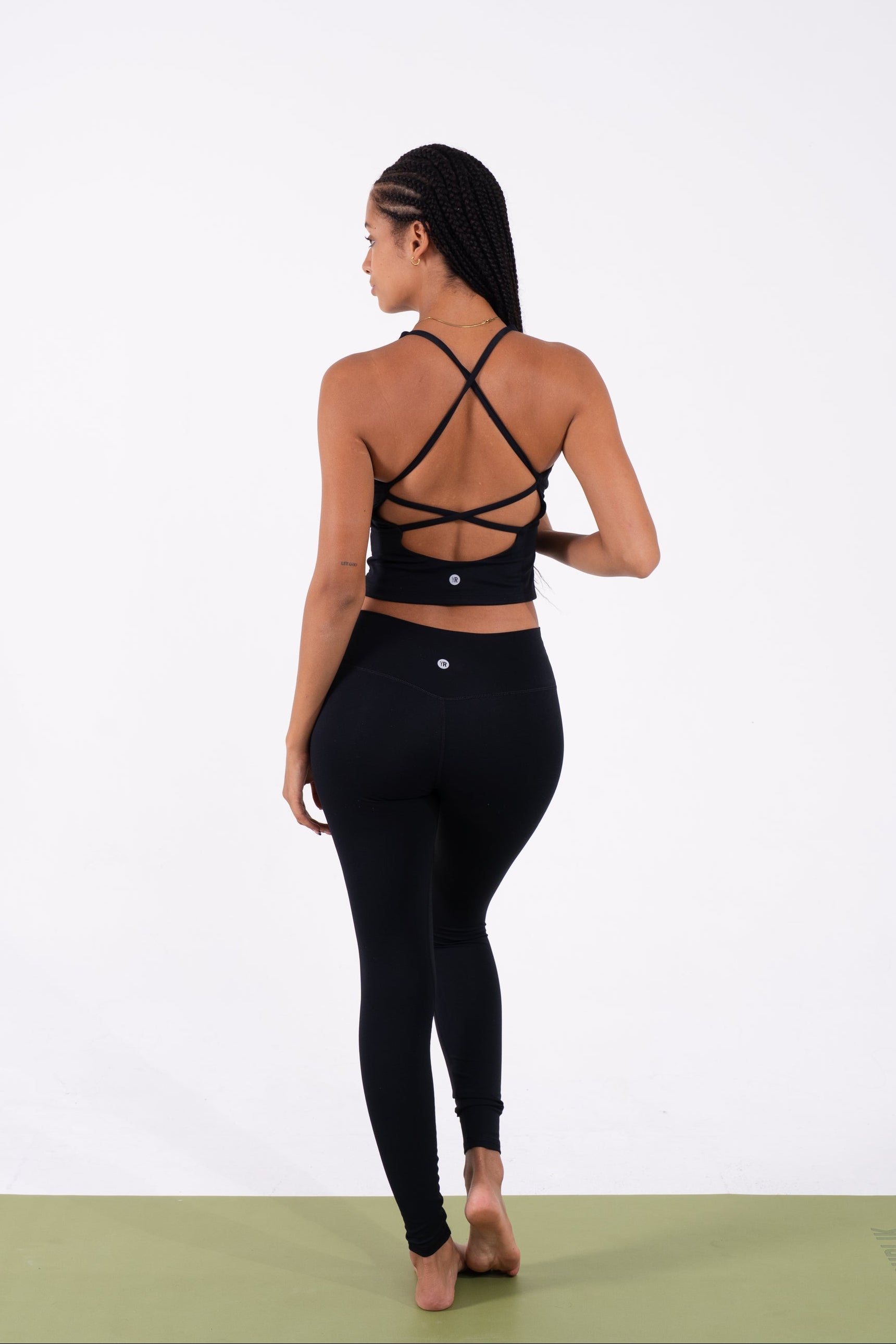 This bra and leggings set combines simplicity on the front with stunning detailing on the back. The sports bra features a classic round neckline, with thin shoulder straps that create an intricate, artistic crisscross design on the back. The leggings have a comfortable high-waisted fit with a sleek, clean cut.