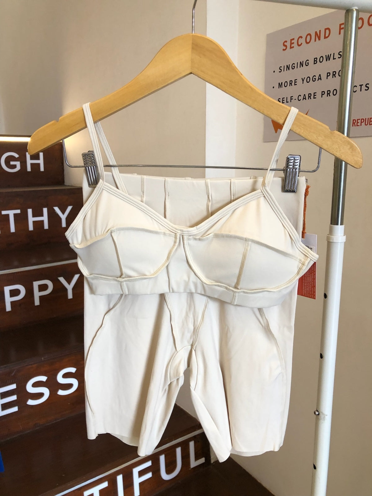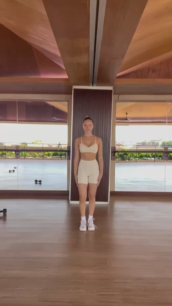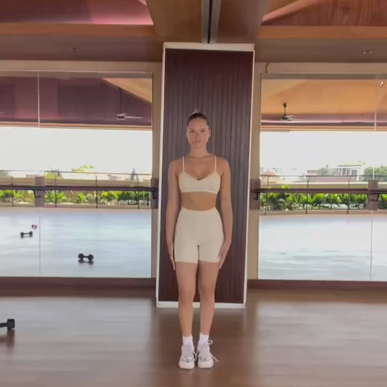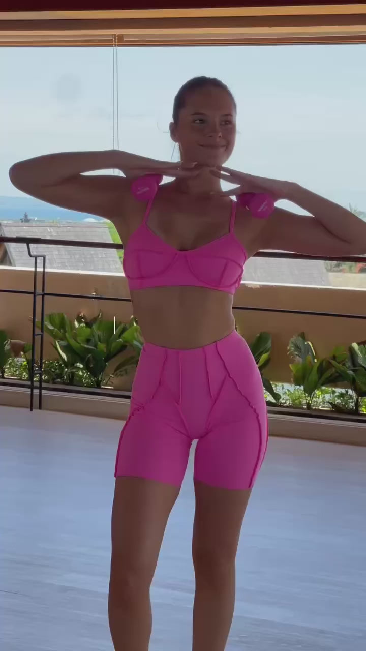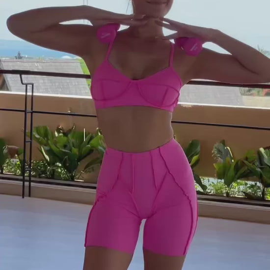 Look stylish and confident in this sports bra and shorts set! The unique design with contrasting stitching details will accentuate your every move. The high-quality material provides maximum comfort and support for all types of workouts. Unleash yourself and achieve your best performance in a set designed for you!