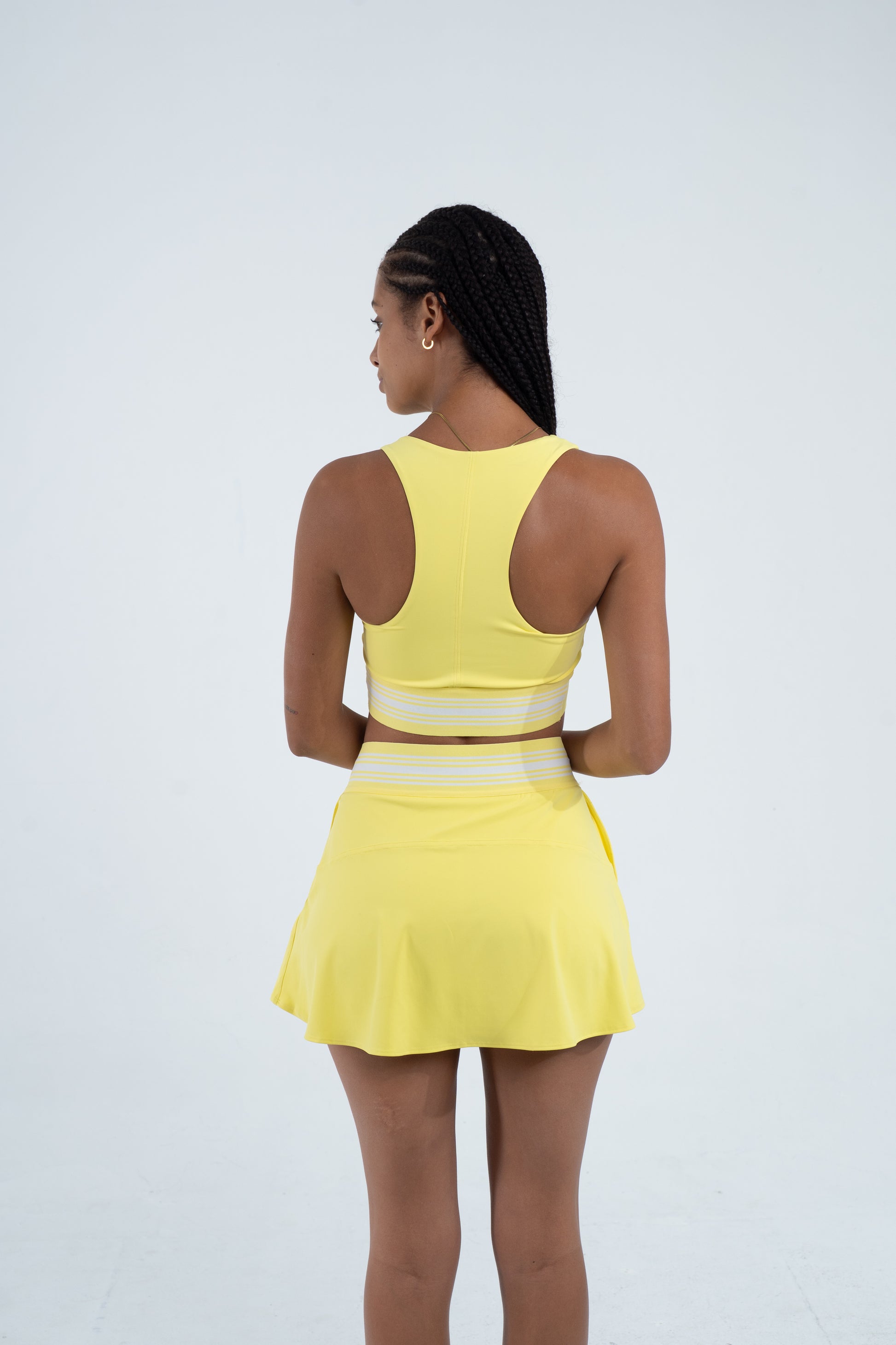 Style and functionality now in one. This tennis bra and skirt set is designed for comfort and freedom of movement. The bra top features a clean, crew neckline and a sleek silhouette. The tennis skirt features a high waist with a unique V-neck detail, and its flared cut follows your every move. This is the perfect set to keep you stylish on the court or relaxing.